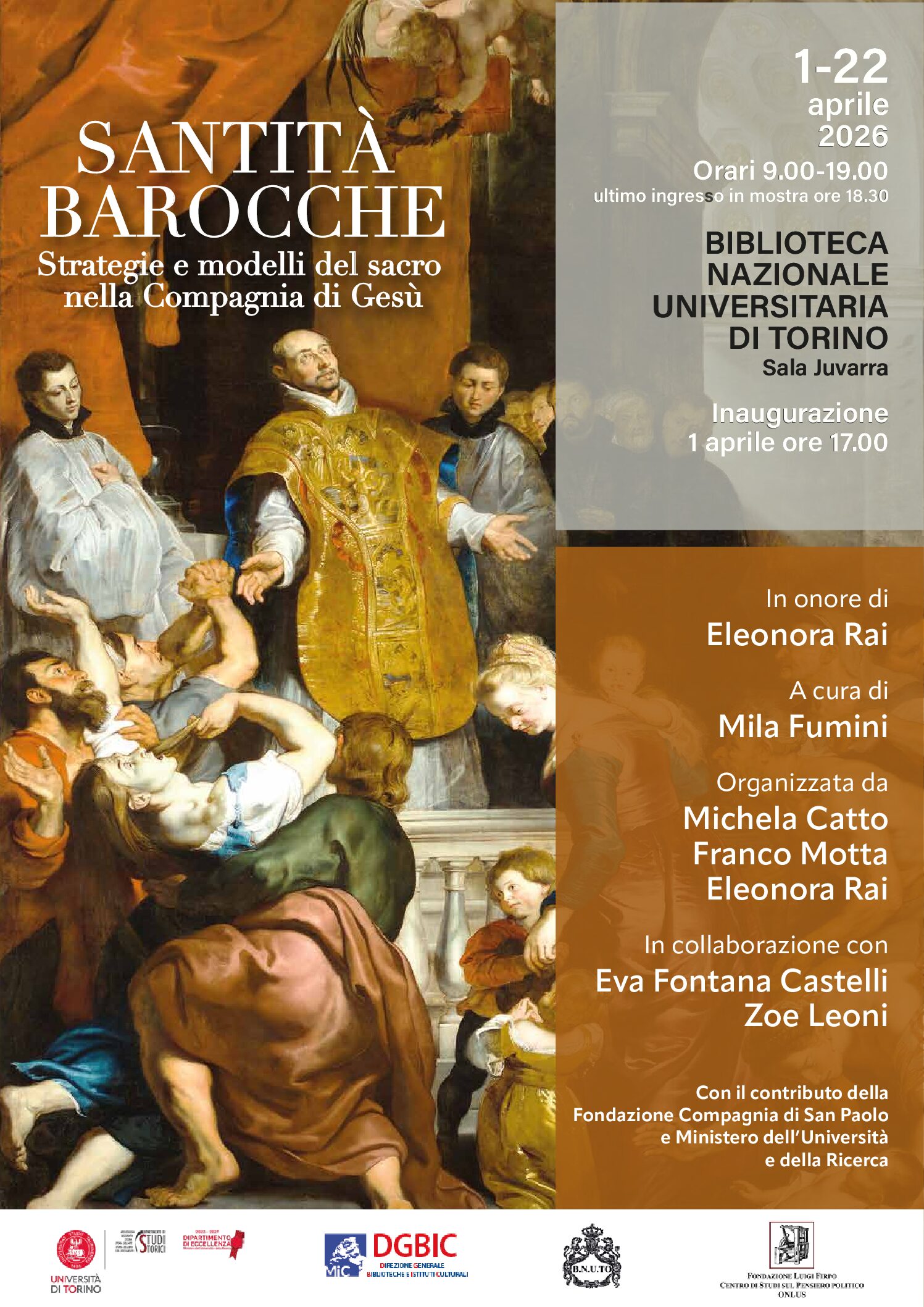 Il 1° aprile 2026 alle 17, presso la Sala Juvarra della Biblioteca Nazionale Universitaria, s’inaugura la mostra Santità barocche. Strategie e modelli del sacro nella Compagnia di Gesù” , curata da Mila Fumini, promossa e organizzata da Michela Catto, Franco Motta, Eleonora Rai, con il sostegno della Compagnia di San Paolo e del Ministero dell’Università e della Ricerca, in collaborazione con la Biblioteca Nazionale e la Fondazione Luigi Firpo. L’esposizione è allestita in onore della professoressa Eleonora Rai, titolare del progetto di ricerca Jesuitization.
