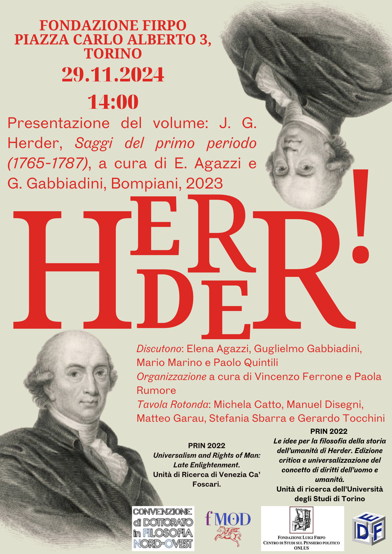 Nell’ambito delle avviate e proficue collaborazioni con diversi Dipartimenti dell’Università di Torino, la Fondazione partecipa all’organizzazione dell’incontro Herder! inserito nel più ampio ventaglio di attività di ricerca e disseminazione che fanno capo al progetto nazionale (PRIN) Universalism and Rights of Man: Late Enlightenment.